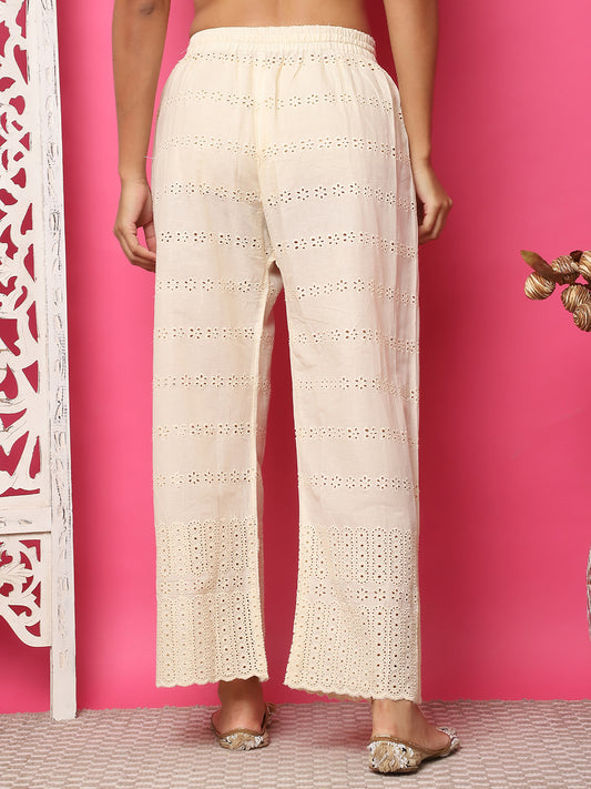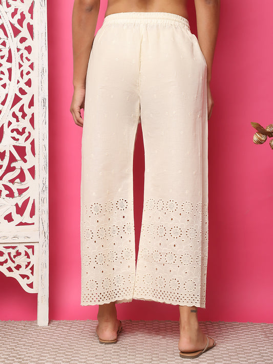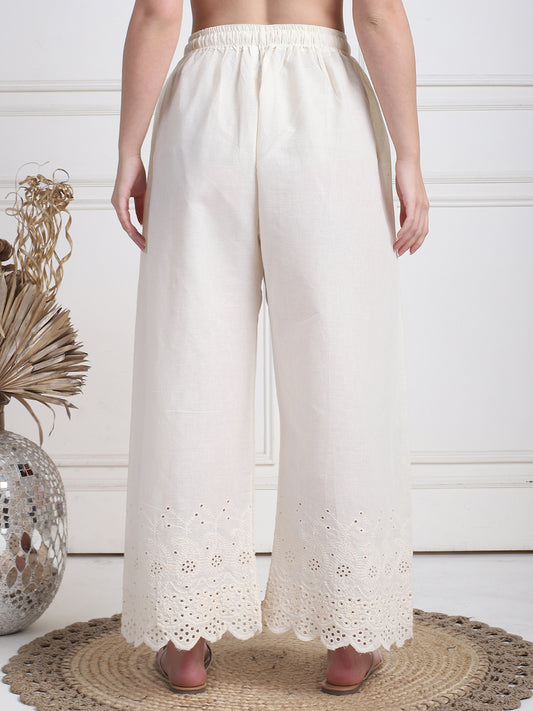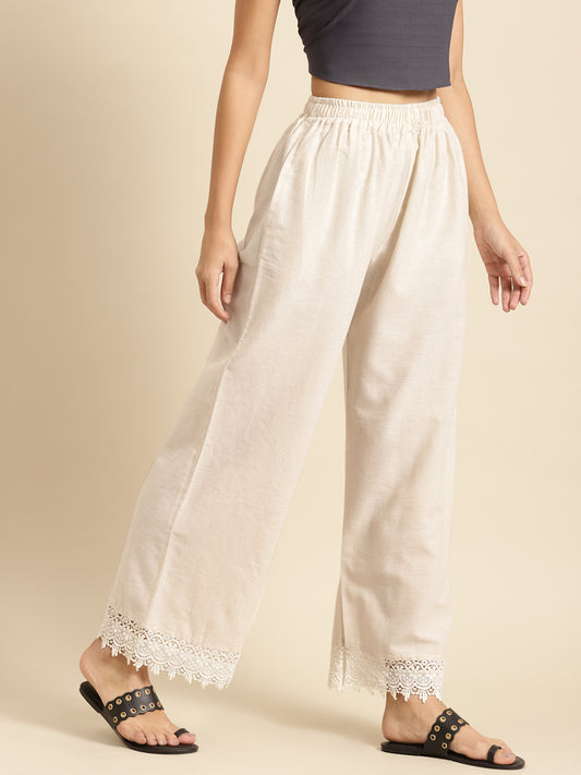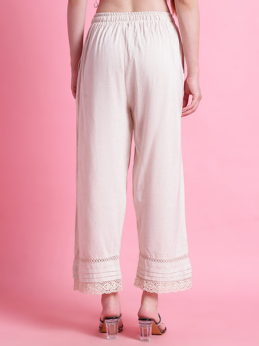 Cream Crotchet Lace Pintex Hem Design Cotton Flax Palazzo