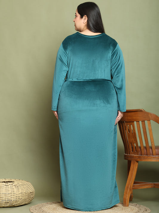 Bottle Green Embroidery Velvet Night Dress