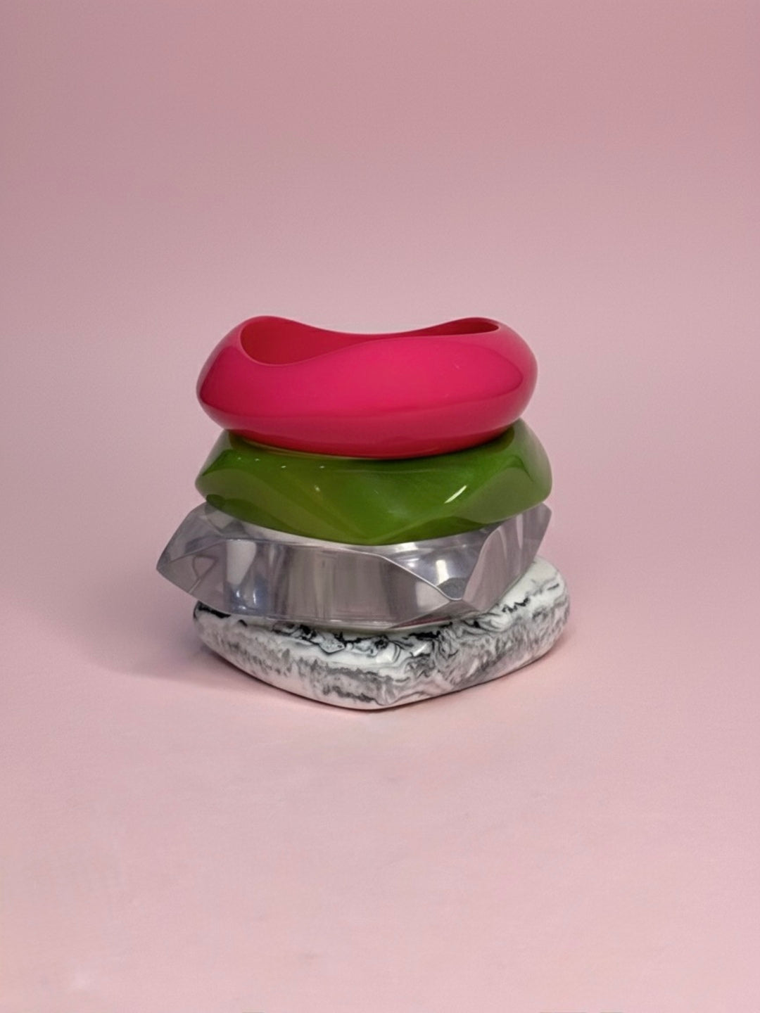 Description: Our resin bangles are lightweight, durable, and designed to add a playful yet chic touch to your look. Each piece is hand-poured and polished for a smooth finish, making it both stylish and comfortable to wear all day. Perfect for stacking or wearing solo, these bangles bring a modern, artsy vibe to any outfit.