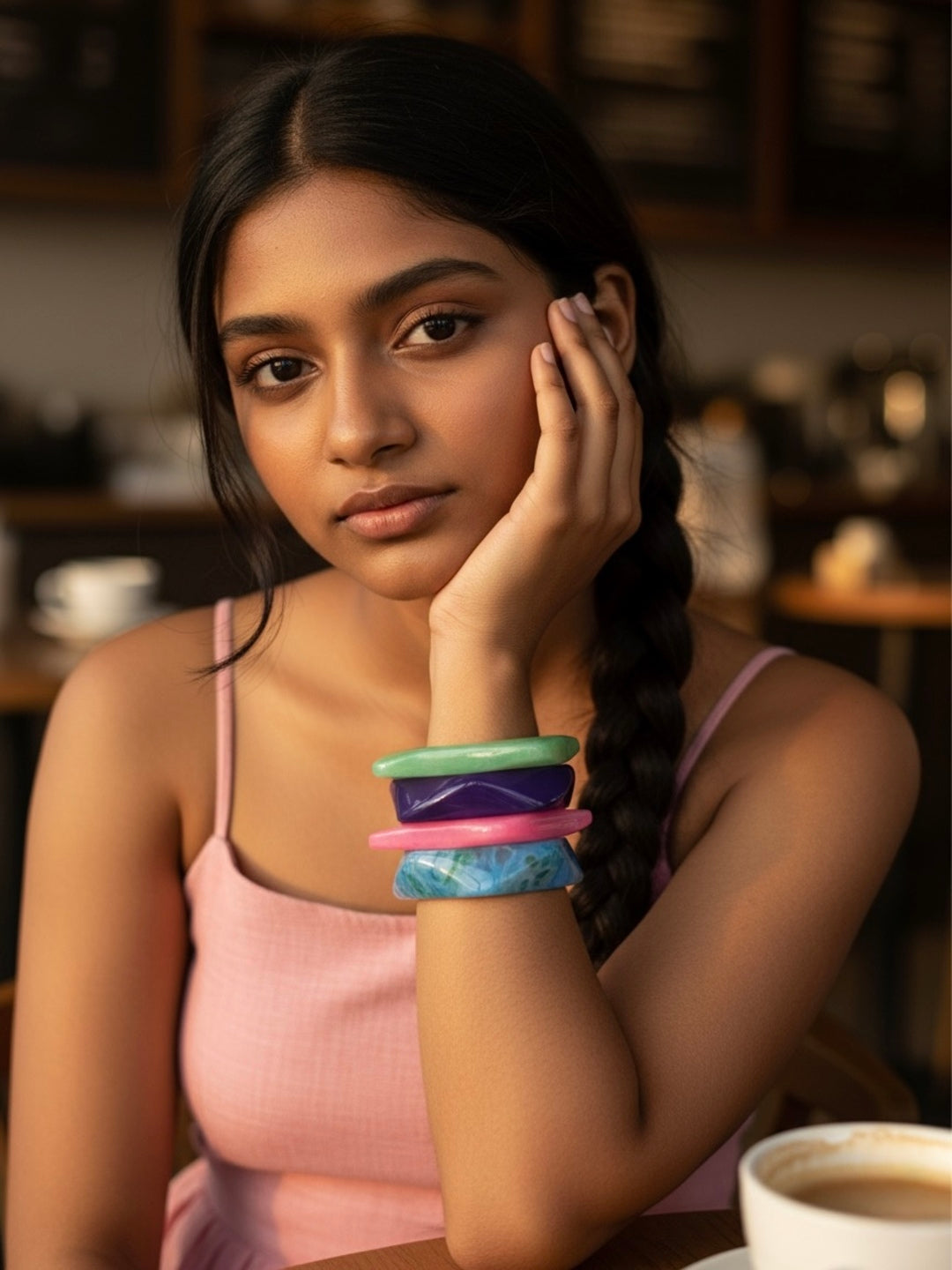 Description: Our resin bangles are lightweight, durable, and designed to add a playful yet chic touch to your look. Each piece is hand-poured and polished for a smooth finish, making it both stylish and comfortable to wear all day. Perfect for stacking or wearing solo, these bangles bring a modern, artsy vibe to any outfit.