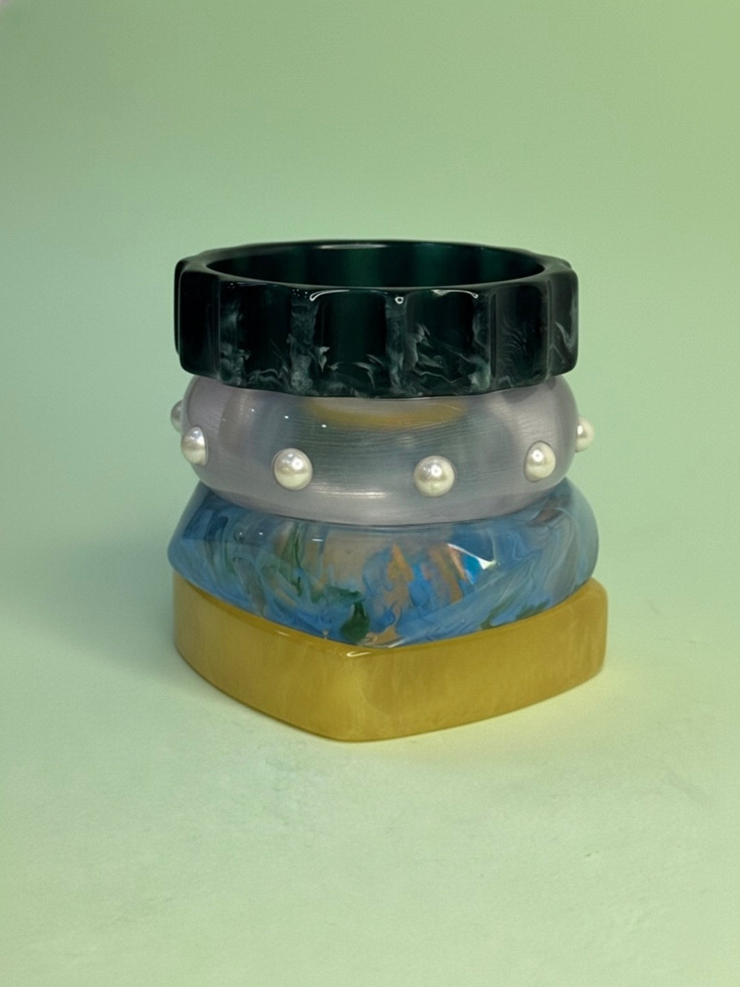 Description: Our resin bangles are lightweight, durable, and designed to add a playful yet chic touch to your look. Each piece is hand-poured and polished for a smooth finish, making it both stylish and comfortable to wear all day. Perfect for stacking or wearing solo, these bangles bring a modern, artsy vibe to any outfit.